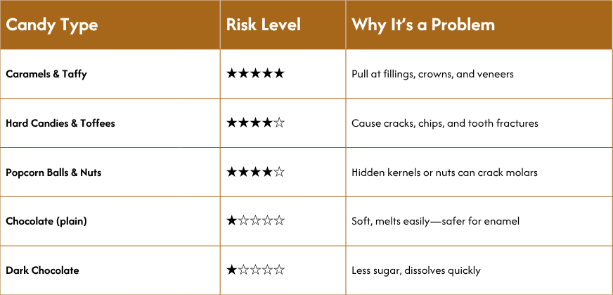 For adults with existing dental work—fillings, crowns, veneers, or implants—Halloween candy can act like a stress test. Those sticky or crunchy sweets pull, twist, and torque in ways teeth weren’t designed to handle.